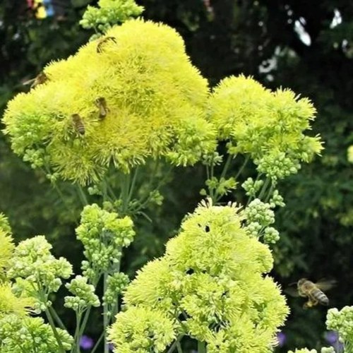 Многолетник достигает 180 см в высоту и формирует вертикальный, слегка раскидистый куст с изящной, сизо-зелёной листвой, похожей на папоротник. Весной побеги поднимаются быстро, летом – раскрываются плотные соцветия лимонно-жёлтого оттенка. Они собраны в рыхлые, пушистые метёлки до 30 см, которые выглядят легко и естественно. Цветение начинается в июле и продолжается до середины августа. Лёгкий аромат привлекает насекомых, делая василистник не только декоративным, но и экологически полезным элементом сада.