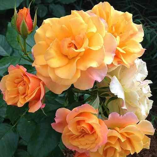 Текила – эффектная красивая роза. Бутоны заостренные, ярко-оранжевые. Цветки абрикосово-жёлтые, выгорают до бело-кремового, чашевидные, рыхлые, закручиваются в разные стороны, крупные (7–8 см), махровые, без запаха, в соцветиях по 2–5 шт. Листья тёмно-зелёные, кожистые, блестящие. Кусты густые, широкие, 80–90 см высотой. Цветение обильное. Устойчив к болезням. Зимостойкий.